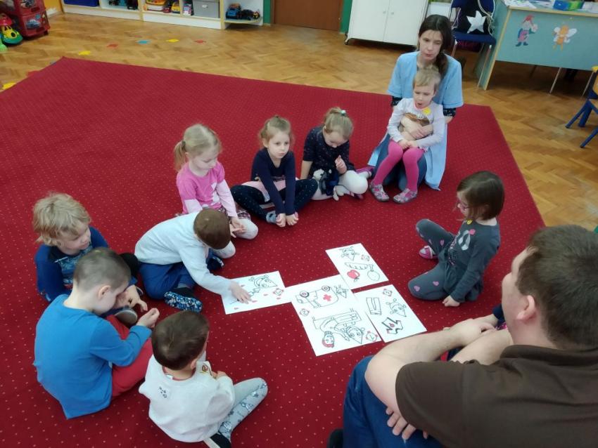 Dzieci z grupy Rybki miały okazję poznać najstarszą polską organizację humanitarną - Polski Czerwony Krzyż. Odwiedził nas pan Marcin, opowiedział czym się zajmuje PCK, jak można pomagać ludziom i jakie jest to ważne dla nas wszystkich.